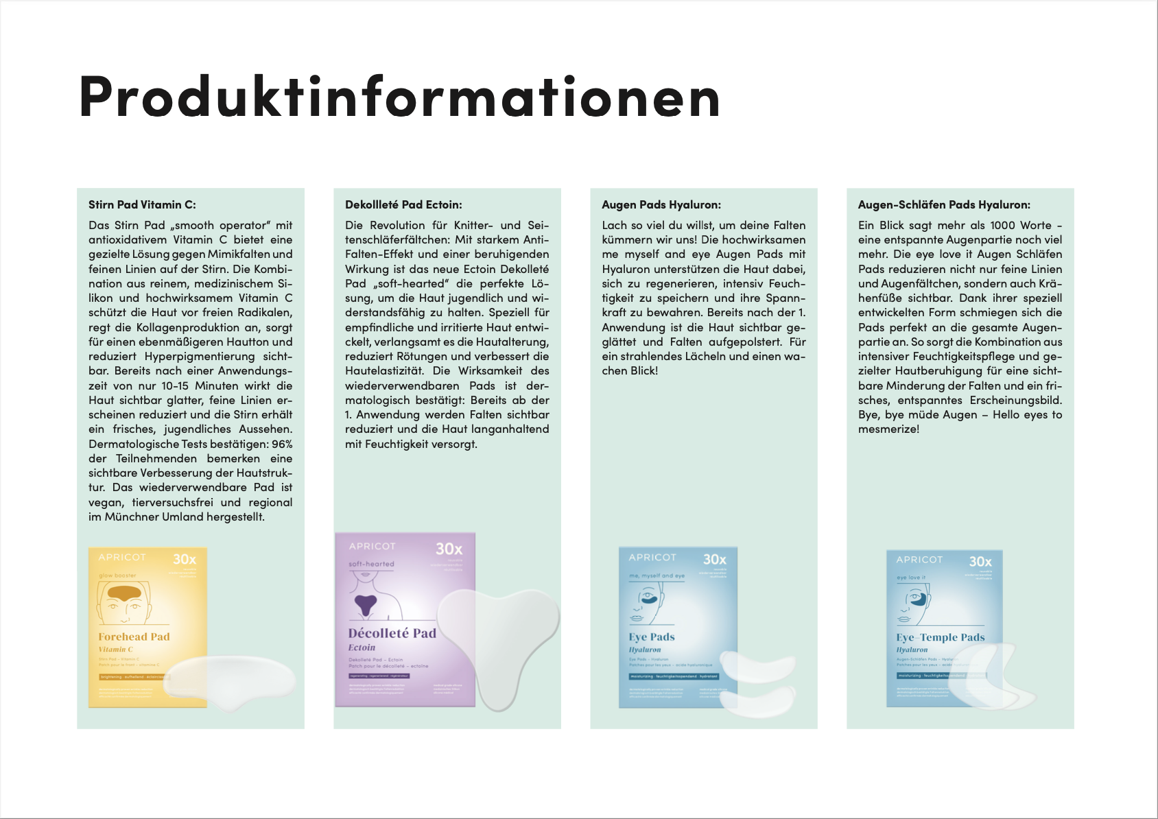 APRICOT Beauty is a Munich-based skincare brand specialising in high-quality anti-wrinkle pads and patches. Using innovative silicone technology with integrated active ingredients, the brand offers fast, effective, and non-invasive skincare solutions.